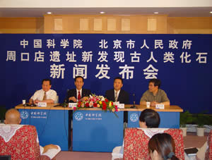中科院負(fù)責(zé)人在會(huì)上宣布,考古人員在周口店遺址附近的田園洞出土了距今約2.5萬(wàn)年的山頂洞人時(shí)期的晚期智人化石。