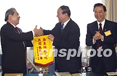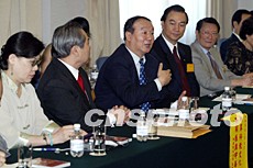 2008年北京奧運(yùn)會(huì)組委會(huì)副主席蔣效愚7月8日在北京會(huì)見以馮滬祥(右一)為團(tuán)長(zhǎng)、郭俊次(右三)為名譽(yù)團(tuán)長(zhǎng)的臺(tái)灣中華教授協(xié)會(huì)大陸參訪團(tuán)成員,并向他們介紹申奧過程和二零零八年北京奧運(yùn)會(huì)的準(zhǔn)備情況。中新社記者:毛建軍