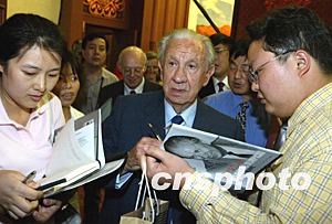 薩馬蘭奇為出席首發(fā)式的中國人民解放軍副總參謀長熊光楷在新書上簽名。中新社記者:毛建軍
