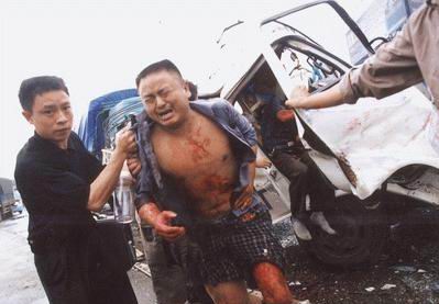 在現(xiàn)場,聚集在受損最為嚴(yán)重的川M05049小貨車周圍的司機此刻也動手救助卡在駕駛室里的同行。要救人就必須移開小貨車前面那輛大貨車,但它已經(jīng)無法發(fā)動,“我來試試!”排在第一的東風(fēng)大貨車司機從破裂的車窗翻進駕駛室,汽車被發(fā)動了!車輪在一厘米一厘米地前移,因猛烈撞擊已經(jīng)交錯纏繞在一起的車體鋼板發(fā)出分離時的撕裂聲,川M05049已成麻花的駕駛室漸漸被移動的前車扯高,當(dāng)最后一塊鋼板脫離時,駕駛室轟然落下,被卡的3名傷者同時高聲喊疼。7時42分大家奮力拉開變形車門,將馬偉和劉德志抱出了險境。重傷者記者鼓勵堅持下去
