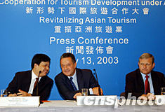 “新形勢下國際旅游合作大會──重振亞洲旅游業(yè)”會議將于七月十四至十五日在香港舉行。來自世界各地的部長、旅游業(yè)界、學(xué)術(shù)界及國際機(jī)構(gòu)代表將出席該會。左起為博鰲亞洲論壇秘書長辦公室主任姚申洪、世界旅游組織秘書長弗朗加利及香港特區(qū)政府副旅游事務(wù)專員柏志高聯(lián)合主持十三日在此間舉行的新聞發(fā)布會。中新社記者:潘索菲