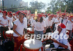 中新網(wǎng)7月14日電 香港昨日擊鼓創(chuàng)造三項(xiàng)世界紀(jì)錄,二千多名鼓手同時(shí)敲擊中國(guó)鼓﹑世界最大的中國(guó)鼓和銅鑼。香港中樂團(tuán)主辦的“香港鼓樂節(jié)”昨天下午在維多利亞足球場(chǎng)舉行“澎湃活力,香港同心”開幕式,打破三項(xiàng)世界紀(jì)錄。
