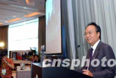 澳門社會事務及文化司長崔世安在香港出席“新形式下國際旅游合作大會”部長圓桌會議時,不忘向業(yè)界人士推介澳門旅游業(yè)。中新社記者:洪少葵