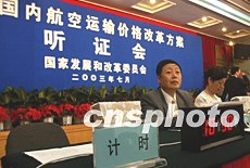廣受關(guān)注的中國民航價格聽證會七月十五日在北京舉行,來自各地的消費者、經(jīng)營者及有關(guān)方面代表將對民航運價改革工作小組起草的《民航國內(nèi)航空運輸價格改革方案》進行公開論證。大會專門安裝記時器,保障每位代表發(fā)言機會均等。中新社記者 武仲林 攝