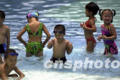 深圳連日持續(xù)高溫,局部氣溫高達(dá)攝氏三十七度,氣象臺(tái)向市民發(fā)出高溫警告,提醒民眾防暑降溫。圖為小朋友們?cè)谟斡境乩锉苁。作?陳文