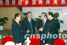 來自臺(tái)灣、香港、澳門以及海外和中國(guó)大陸的百余位專家學(xué)者十六日抵達(dá)麗江,出席十七日即將舉行的2003年海峽兩岸關(guān)系論壇。圖為國(guó)務(wù)院臺(tái)辦副主任王在希、海研中心主任唐樹備、云南省副省長(zhǎng)邵琪偉與來自臺(tái)灣的郭俊次先生一起交談。中新社記者:毛建軍