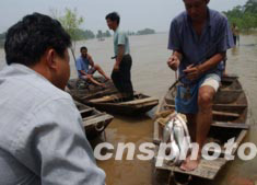 今夏淮河洪水淹沒千里漁米之鄉(xiāng)的魚塘,養(yǎng)魚農(nóng)民血本無(wú)歸;茨系貐^(qū)泄洪區(qū)漁民在洪水中捕撈流失的鮮魚,忍痛以一元錢三斤賣出。中新社記者:賈國(guó)榮