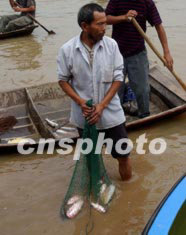 今夏淮河洪水淹沒千里漁米之鄉(xiāng)的魚塘,養(yǎng)魚農(nóng)民血本無(wú)歸。安徽省阜陽(yáng)縣王家壩的漁民和村民目前抓緊撒網(wǎng)捕撈流失之魚,略補(bǔ)生活損失。中新社記者:賈國(guó)榮