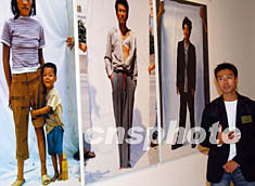 “香港藝術(shù)雙年展2003”,七月二十二日在香港藝術(shù)館舉行新聞發(fā)布會(huì),此次展覽共收到1500多件參賽作品,最后評(píng)選出十個(gè)優(yōu)秀獎(jiǎng)。圖為胡健一向賓客介紹他的攝影作品《游人》。中新社記者:錢興強(qiáng)
