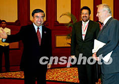 中國商務(wù)部部長呂福源,二十二日在大連會見包括奧地利經(jīng)濟(jì)勞動部副部長約瑟夫·邁耶爾(右一)在內(nèi)的部分出席第五屆亞歐經(jīng)濟(jì)部長會議代表團(tuán)成員。作者:鄭萍萍