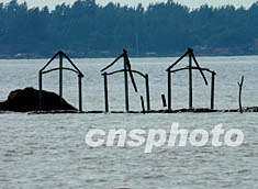 圖:淮河水位下降民工時(shí)刻堅(jiān)守大堤