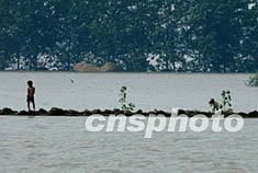 中國(guó)安徽省今夏發(fā)生近五十年最嚴(yán)重的淮河洪水,前兩次洪峰因及時(shí)分洪而去,但第三次洪峰正在形成。圖為穎上縣的洪水與行洪區(qū)連成一片,土堤上的孩子和小狗處境堪憂。中新社記者:賈國(guó)榮