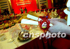 二十三日晚舉行的第五屆亞歐經濟部長會議歡迎晚宴上,用富有中國民族特色的京劇臉譜包扎的菜譜成為不少外賓的收藏品。中新社記者:鄭萍萍