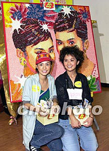 人氣組合Twins兩名成員鐘欣桐(左)、蔡卓妍7月23日在香港出席《Jelly Belly“Twins”糖豆畫》宣傳活動(dòng),“Twins”糖豆畫用上五十種顏色壹萬(wàn)粒Jelly Belly糖豆黏到木板上成畫。作者:鄧慶樂(lè)