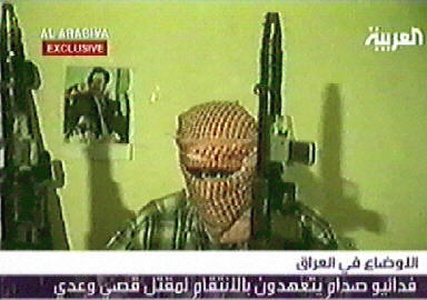 總部設(shè)在迪拜的阿拉比亞電視臺(tái)24日播出的一盤錄像帶畫面顯示,一群自稱“薩達(dá)姆敢死隊(duì)”成員的戴著面具、持槍男子發(fā)誓要發(fā)動(dòng)更多針對(duì)美軍襲擊,為薩達(dá)姆的兒子烏代和庫(kù)賽復(fù)仇。