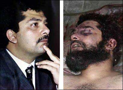 烏代、庫賽兩兄弟被擊斃的照片,是由美軍在巴格達(dá)公布。照片顯示兩人躺在地上,臉朝上,眼睛閉著,臉部有許多血跡,庫賽的臉上出現(xiàn)一道很深的傷痕。兩人都留了濃密的胡須,顯然企圖偽裝。