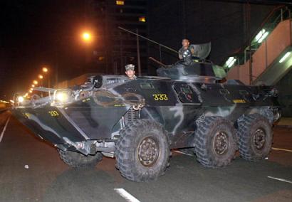 據(jù)法新社報道,阿羅約發(fā)表全國電視講話說:“我限令你們在今天下午五點之前投降繳械,回到兵營去!