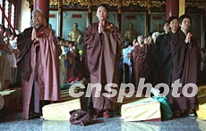 慶典儀式于上午十時(shí)在潭柘寺大雄寶殿外小廣場(chǎng)舉行。大雄寶殿上方“潭柘寺建寺一千六百九十六年暨祈禱世界和平國(guó)泰民安法會(huì)”紅色橫幅十分醒目。北京佛教協(xié)會(huì)、北京市文物局、北京市旅游局負(fù)責(zé)人以及數(shù)百名中外游客參加了慶典儀式。隨后,潭柘寺方丈常道法師在大雄寶殿內(nèi)主持法會(huì)。二十多位住寺僧侶及眾多善男信女在缽和木魚(yú)等敲打樂(lè)的伴奏下吟唱佛經(jīng)。常道法師向佛像敬香、頂禮膜拜,祈禱世界和平國(guó)泰民安。