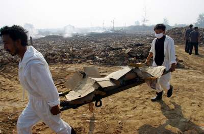 圖:醫(yī)務(wù)工作者搶運(yùn)辛集爆炸煙花廠遇難者
