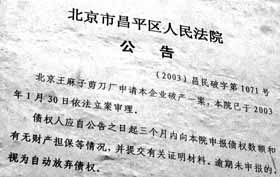 王麻子剪刀廠申請破產(chǎn)后,按照相關(guān)法律程序,法院在立案后,將有3個月的公告期,最終依法宣告破產(chǎn)。在破產(chǎn)清算后,用剩余資產(chǎn)安置職工、還貸、還債。宣告破產(chǎn)后,“王麻子”可以甩掉多大的經(jīng)濟包袱,廠方?jīng)]有明確的答復(fù),但他們認為更重要的是多年來“剪不斷理還亂”的歷史問題該有個說法。(據(jù)《每日新報》)
