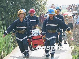 武警、消防、公安、當(dāng)?shù)伛v軍及醫(yī)護(hù)人員在現(xiàn)場全力搜救。中新社記者:劉可耕  消防人員向爆炸現(xiàn)場緊急運(yùn)送消防設(shè)備。中新社記者:劉可耕