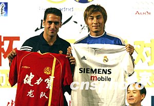 西班牙皇家馬德里足球隊(duì)與中國(guó)健力寶龍隊(duì)八月一日在北京飯店舉行賽前新聞發(fā)布會(huì),皇馬隊(duì)長(zhǎng)勞爾與龍隊(duì)隊(duì)長(zhǎng)李瑋峰在會(huì)上互贈(zèng)隊(duì)服。中新社記者:毛建軍