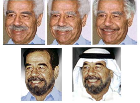 據(jù)路透社報道,這些照片包括通常蓄髭且深發(fā)的薩達姆若留胡須、把臉刮干凈、白發(fā)或灰發(fā)的模樣,還有一張為他戴著傳統(tǒng)阿拉伯頭巾的樣子。這些照片都已經(jīng)發(fā)給正在伊拉克全力搜索薩達姆的軍隊。