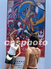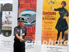 歷屆奧運會會徽宣傳畫八月三日列陣北京天壇祈年殿前的昔日皇家神路兩旁,迎候神秘的北京2008年奧運會會徽當晚夜幕降臨時在此大白于天下。中新社記者:賈國榮