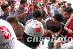 八月四日是2008北京奧運會徽揭曉后的第一天,大批市民一大早擁向北京百貨大樓搶購T恤衫、球帽等會徽紀念產(chǎn)品。中新社記者:張煒