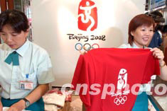 八月四日是2008北京奧運會徽揭曉后的第一天,會徽紀念產(chǎn)品開始在北京定點商場限量發(fā)售。北京百貨大樓的營業(yè)員正在向顧客展示紀念T恤衫,最便宜的T恤衫每件賣108元人民幣。中新社記者:張煒