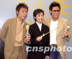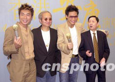 歌星許志安、蘇永康8月4日出席其《香港安康演唱會(huì)》記者會(huì),兩人獲經(jīng)理人黃柏高(左二)及演唱會(huì)主辦機(jī)構(gòu)老板張耀榮(右一)送上鉆石咪高峰造勢(shì)助慶。中新社記者:鄧慶樂