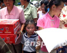 圖:高溫中的淮河災(zāi)民獲得軍方捐贈食品