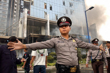爆炸發(fā)生后,濃煙烈火從酒店的地下層冒出來。爆炸已經(jīng)摧毀了一個(gè)酒店里的一家餐廳,酒店的大堂也部分受損。酒店的大堂以及門口停放的8輛汽車在燃燒。酒店及附近一幢高樓的多個(gè)樓層窗戶的玻璃被震碎。印尼《羅盤報(bào)》的一名記者說:“我看見幾輛出租車在燃燒,我相信是汽車炸彈引起了爆炸。八名受傷的人中有外國人!