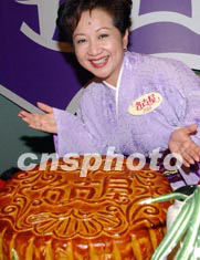 香港電臺著名節(jié)目主持人薛家燕,八月五日在香港舉行的“美食與中醫(yī)藥博覽會”新聞發(fā)布會上,為一家食品商推出“月餅王”。中新社記者:錢興強