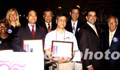 華裔小商業(yè)八月五日成為紐約納斯達克交易所的明星,四名華裔商家在這里受到美國聯(lián)邦中小企業(yè)管理局的表彰。圖為美國聯(lián)邦中小企業(yè)管理局局長赫克托·巴雷特(右二)向獲獎者頒獎。作者:趙海燕