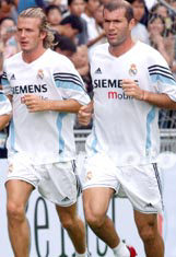 圖為球星貝克漢姆和施丹在訓(xùn)練場(chǎng)上。