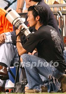 香港明星謝霆鋒,八月八日在香港大球場(chǎng)觀戰(zhàn)西班牙勁旅皇家馬德里對(duì)香港聯(lián)隊(duì)的比賽,并出動(dòng)私伙長(zhǎng)短炮,充當(dāng)攝影師拍攝偶像。中新社記者:錢(qián)興強(qiáng)