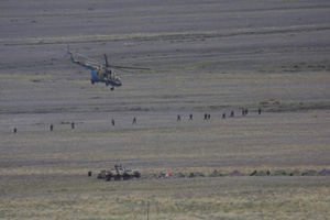 聯(lián)合指揮部迅速作出應對之策,指揮參演國武裝力量,在空中武裝直升機、特種空降部隊和地面裝甲、火炮、特種作戰(zhàn)等部隊的空地密切配合下,對非法越界的武裝分子展開了猛烈的攻勢。
