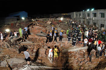 消防人員正在搶救壓在廢墟中的民工李建華