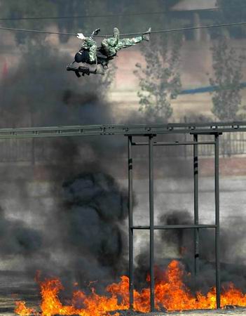 中新網(wǎng)8月11日電 今天上午,武警部隊(duì)在北京南郊成功舉行處置突發(fā)事件綜合演練。從利用裝甲防暴車(chē)車(chē)載機(jī)槍對(duì)固定目標(biāo)射擊到計(jì)算機(jī)模擬戰(zhàn)斗射擊,從液壓式切割鏈鋸效能展示到動(dòng)力飛行器飛行技能演示,從處置武裝襲擊事件到處置大規(guī)模劫持人質(zhì)事件,由1500名武警官兵參加的綜合演練高潮迭起。