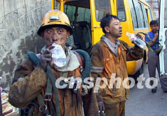 山西大同市杏兒溝煤礦第六批救護(hù)隊(duì)員在瓦斯爆炸現(xiàn)場(chǎng)連續(xù)工作十小時(shí),搶救依然失蹤的5名礦工。13日,他們走出坑口后,第一件事就是喝水。杏兒溝煤礦“八·一一”瓦斯爆炸已造成三十七人死亡。作者:王煥偉