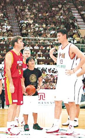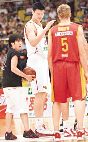 然后由霆鋒及小師妹戴嬌倩介紹澳洲老虎隊及中國國家隊球員出場,當介紹姚明出場時,霆鋒不忘玩噱頭,對全場觀眾說:“請問一下誰是二米二六的亞洲小巨人——他就是姚明!”全場觀眾歡欣若狂。