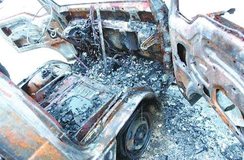 肇事的車子是0.6噸貨車,車上的擋風玻璃已經(jīng)完全破碎,前兩輪胎處只剩下架子,方向盤只剩下圓形金屬,以及一把土制手槍、一把尖刀。值得一提的是,在車輛的殘骸上還有大量的塑料桶,有的是藍色,有的是白色,據(jù)一保安介紹,這些塑料桶是用來裝易燃液體的。昨天上午9時47分,一輛車身標志是“刑事勘察車”的車輛駛?cè)氪逦瘯笤,從車上走下來?shù)位警員,現(xiàn)場一共10多名警察不時交談著什么。最后警察將所有證物搬上車子后方離開。