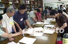 原定于六月進行的中國普通高等學校二零零三年招收華僑、港澳、臺灣省學生考試,因受“非典”影響改于本月十五日至十七日進行,圖為澳門考區(qū)的監(jiān)考老師們在考試結束后當場封卷。中新社記者:李剛