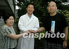 北京SARS醫(yī)療專家、人民醫(yī)院ICU主任安友仲教授,8月15日到北京地壇醫(yī)院祝賀將于16日出院的中國最后兩名SARS康復患者孫崢(右)、盧志艷(中)。安友仲教授曾在過去的三個月內分別參予這兩名患者的轉院搶救治療。中新社記者:任晨鳴
