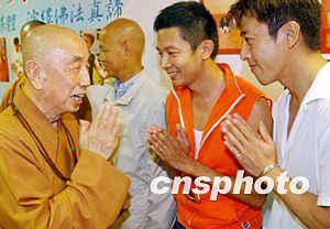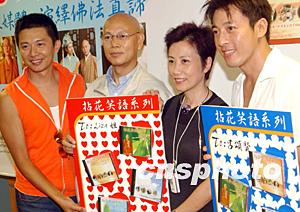 由星加坡福海禪院與好合拍多媒體集團(tuán)合作出版的《拈花笑語系列》光盤發(fā)布會八月十八日在香港舉行,圖為明義法師(左)與香港藝員何寶生(中)、呂頌賢(右)在新聞發(fā)布會上。中新社記者:錢興強