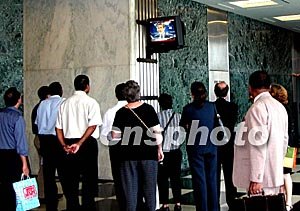 聯(lián)合國駐巴格達總部大樓十九日被炸后,紐約聯(lián)合國總部的工作人員聚集在大廳內(nèi)的電視機前收看新聞,關注著在巴格達同事的安全。中新社記者:趙海燕