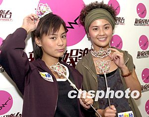 樂壇組合Twins兩名成員鐘欣桐(阿嬌)、蔡卓妍(阿Sa)(左起)8月20日在香港出席新城電臺(tái)節(jié)目《聯(lián)Fan所》之“愛菩私家訪”訪問,由于Twins新唱片于九月推出,電臺(tái)DJ送上玩具后冠、令牌,比喻港姐快將出爐。作者:鄧慶樂