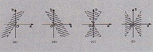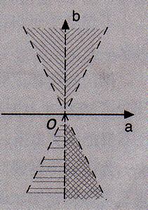 在圖A、B和D中,凡邊界均以虛線示之,凡不連通的區(qū)域均以不同斜率的陰影線區(qū)別之。然而,在標準答案圖C中的b軸用實線表示,并且b軸兩側(cè)與b軸相鄰的角形區(qū)域用同一斜率的連貫陰影線表示為單一的連通區(qū)域,所以b軸明確地不是邊界。這樣就使“不包括邊界”這個附注不能對b軸發(fā)生作用。圖C中只有兩根邊界(虛線表示),所以圖像M表示了不等式F(|b|>|2a|),而不表示不等式E(|b|>|2a|,且a≠0)。所以標準答案圖C是錯誤的。四個選項中沒有一個正確,這與提示中所說“在每小題給出的四個選項中,只有一項是符合題目要求的”相矛盾,從而該題是錯題!而正確答案應為圖二。