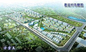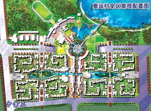 這個設計方案把傳統(tǒng)的中國住宅規(guī)劃模式轉(zhuǎn)化為由奧運五環(huán)幻化而成的曲線,圓形升旗廣場象征“龍珠”。